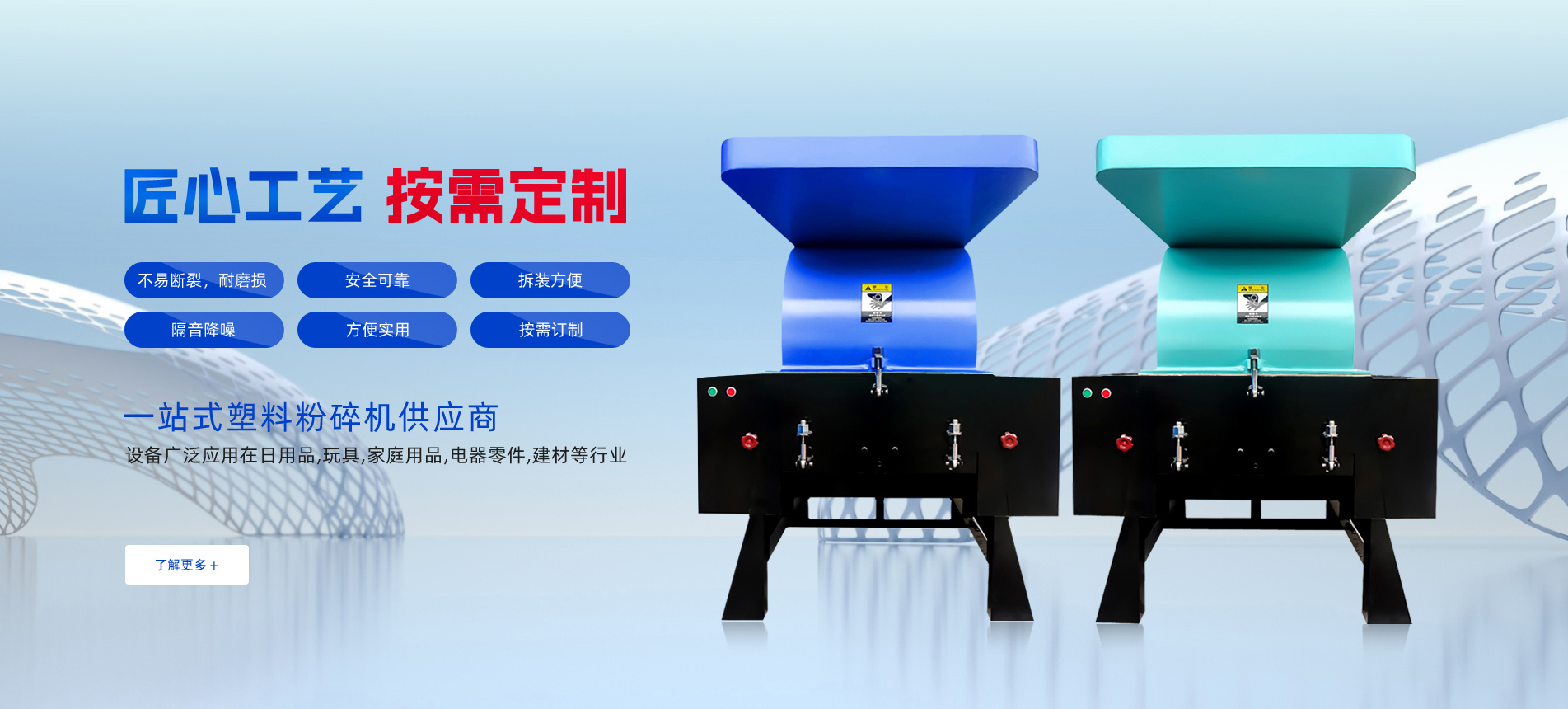 本公司系列產(chǎn)品以其卓越的性能、高性?xún)r(jià)比聞名于塑料輔助機(jī)械行業(yè)。主要產(chǎn)品有:粉碎機(jī)、 干燥機(jī)、吸料機(jī)、模溫機(jī)、拌料機(jī)、冷水機(jī)、冷卻塔等等!我公司還聯(lián)合了國(guó)內(nèi)知名的塑機(jī)輔機(jī)經(jīng)銷(xiāo)商,希望為廣大用戶(hù)提供子力品牌系列的優(yōu)質(zhì)產(chǎn)品和更及時(shí)更完善的售后服務(wù)!